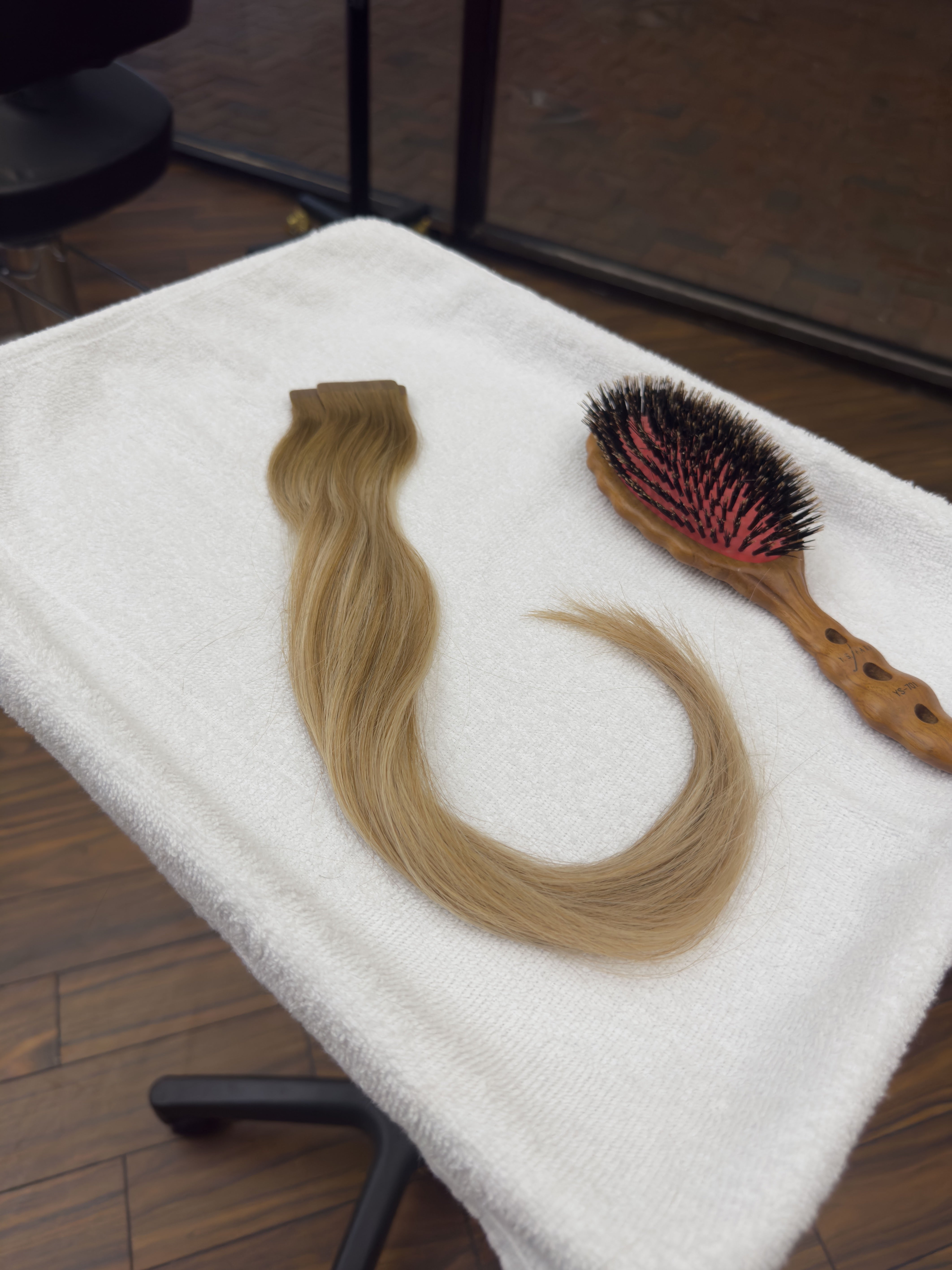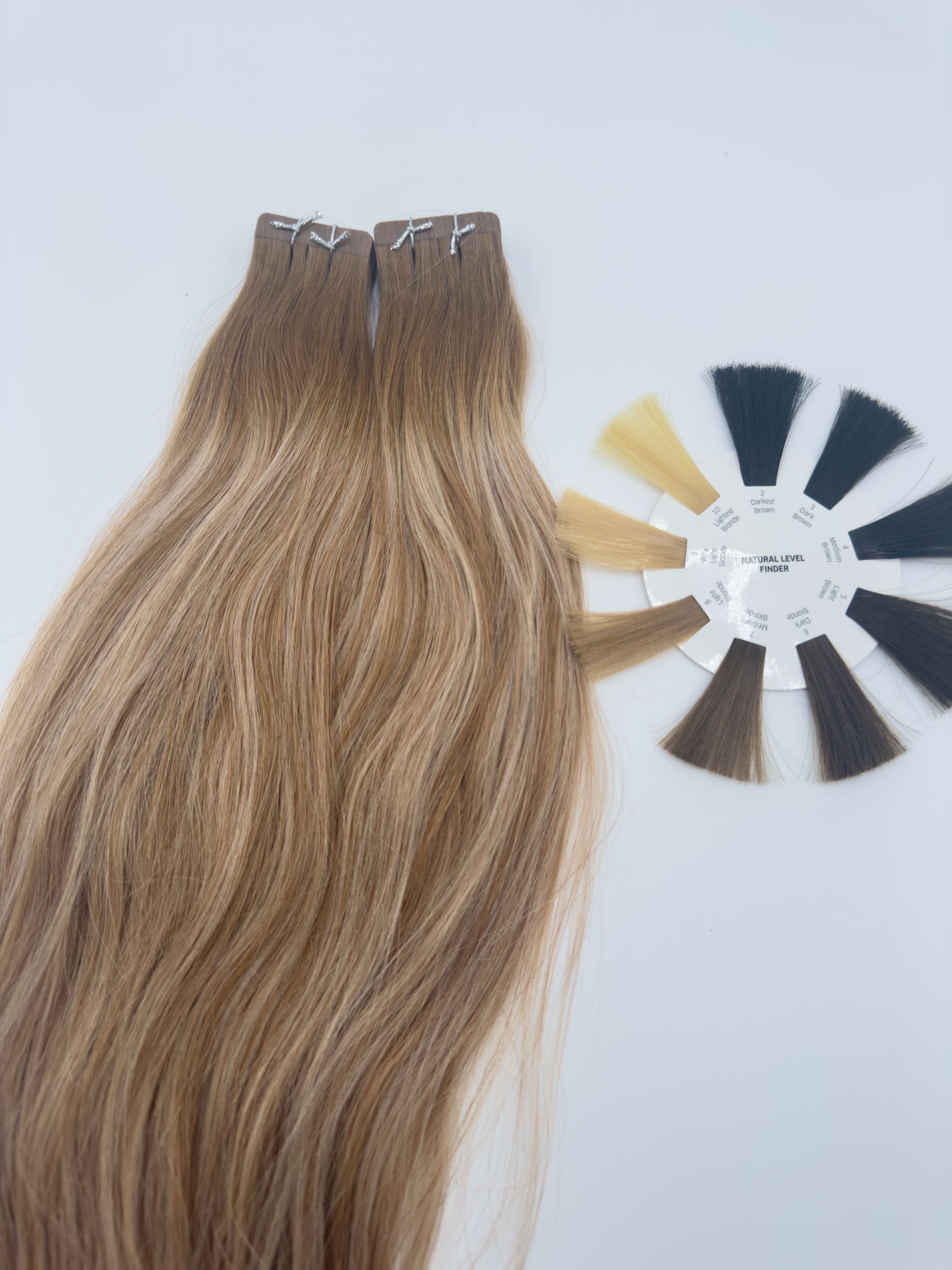 Radiating pure sophistication, Champagne Crème captures the essence of sun-kissed luxury. This luminous blonde features a soft fusion of golden blonde and platinum, delicately melted into a toffee caramel for seamless dimension and natural depth. The result is an effortlessly elegant tone that glows from root to tip — perfect for creating timeless, high-end installs that exude polish and grace.